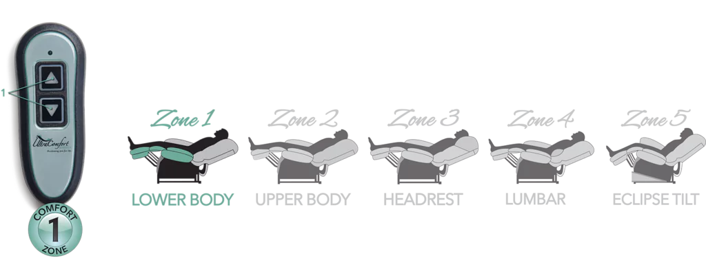 Comfort Zone 1 provides ergonomic placement of your lower body allowing your muscles to relax for long-lasting comfort. Each Comfort Zone 1 can be adjusted using the two buttons on the hand control.