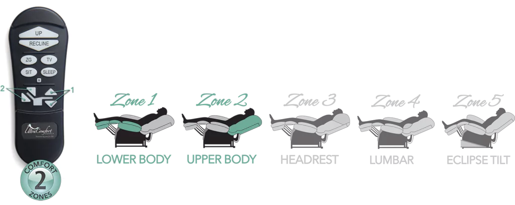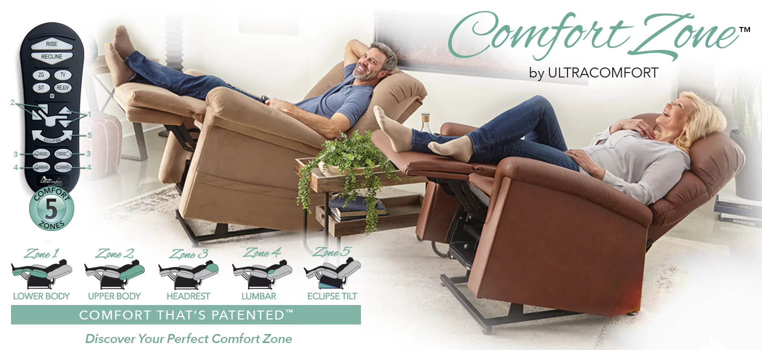 The Comfort Zone by UltraComfort offers a stress-free reclining experience by providing patented, adjustable and supportive positioning zones that can increase your body’s wellness and optimize the feeling of comfort.