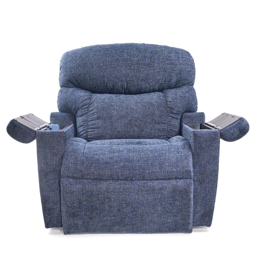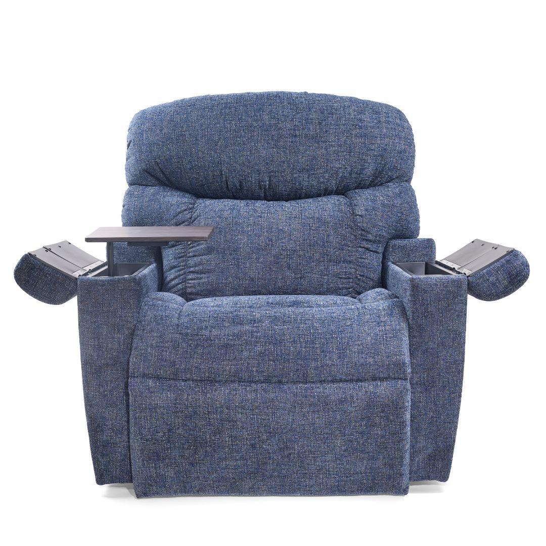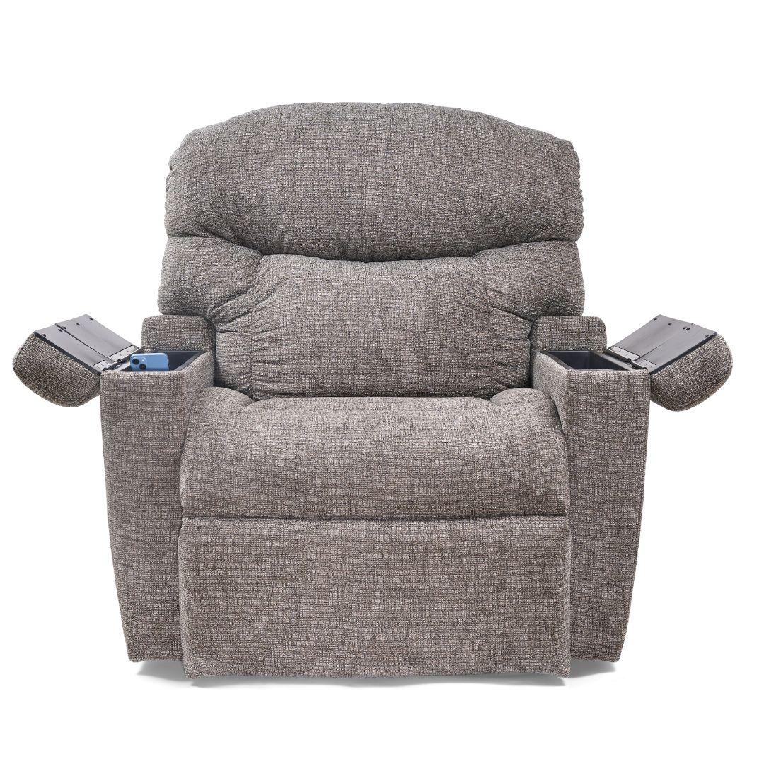 Right arm compartments feature the hand control dock, wireless phone charger, and power port that holds either the LED reading light or removeable butler tray table that come standard. Left arm compartments feature a drink holder, USB charging port and more storage. In addition, you can choose from an exciting array of optional accessories including a Bluetooth speaker, tablet holder, flex light, color-changing snack bowl, fan, and diffuser.