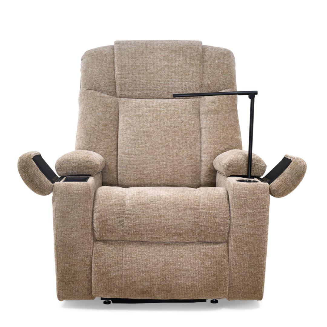 - Open-Arm Storage & Convenience – Built-in cup holder, hidden storage compartments, USB charging port, removable LED reading light, tray table, and wireless smartphone charger—all within arm’s reach.